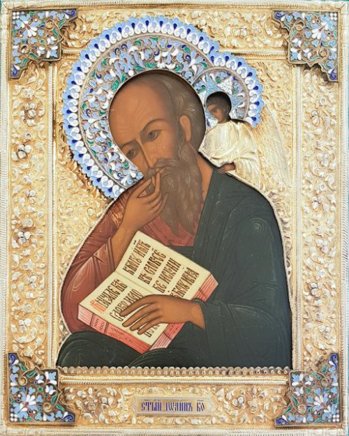 Wood, gesso, tempera, silver enamel. It is a similar icon with the classic iconography of the saint. He stylizes ancient Russian samples of the 17th century with a basma pattern of fields and decorative castle corners. Attention is focused on the face and crown of the saint. The enamel setting gives a special solemnity to the image.